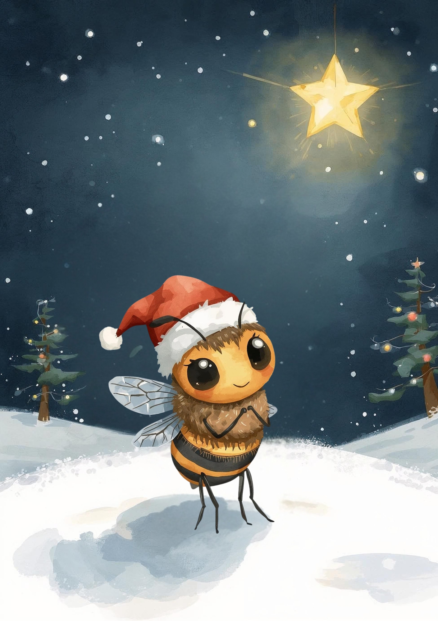 In the hush of a snowy Christmas night, a tiny bee looks up at a glowing star, as if it’s listening to a secret only the sky can tell.